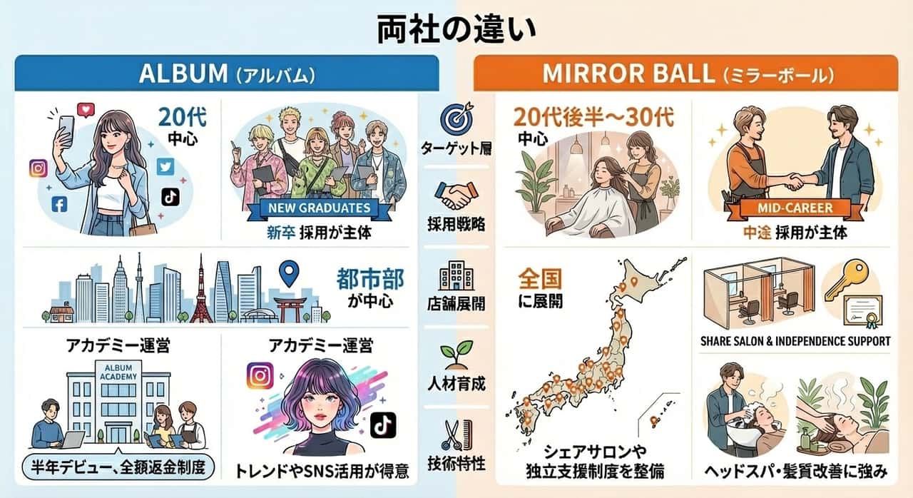 地方・中途 vs 都市・新卒:ミラーボールの全国店舗網と中途採用の強みに、ALBUMの都心での強さと新卒育成アカデミーが加わり、採用・出店チャネルが全方位化。